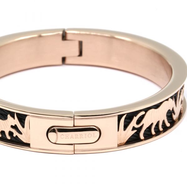 Rose gold PVD hard shape steel bangle with 4 black cables. A figurative design features the silhouette of a tiger stalking the jungle, a precocious cub in tow. This rose gold PVD decor repeats against our signature twisted black PVD cables.