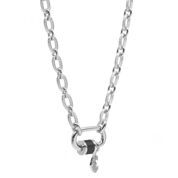 All steel link necklace featuring a padlock pattern decorated with black PVD cables. Dimensions of the lock 24(W) * 13(H) * 8(D)mm, total length 44cm.
