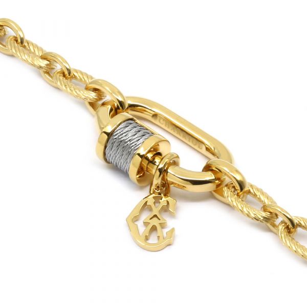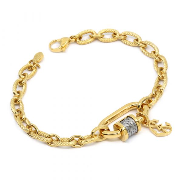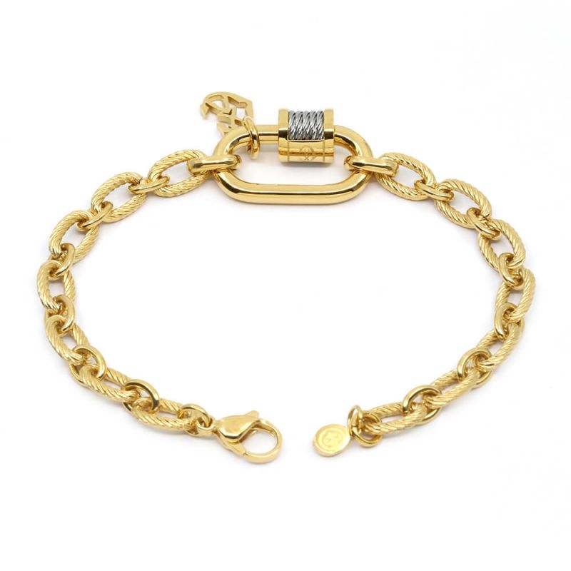 Hot yellow bracelet, made of yellow gold plated links, supporting a padlock pattern decorated with 5 steel cables diamter 1mm. Dimensions of the lock 24(W) * 13(H) * 8(D)mm, total length 18cm (adjustable).