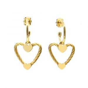 Golden time - an original 18mm heart-shaped dangle earring, composed of 2 strands of yellow gold PVD steel cables and 2 heart-shaped yellow gold decorations. Doesn't passion make two hearts beat as one?