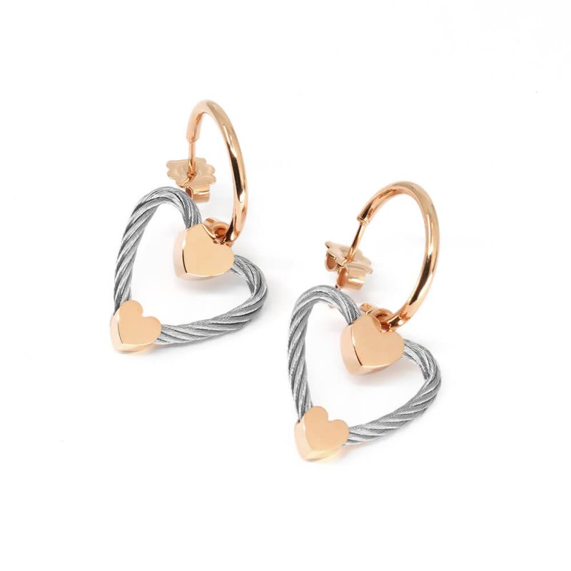 An original 18mm heart-shaped dangle earring, composed of 2 strands of steel cables and 2 heart-shaped decorations in rose gold PVD steel. Doesn't passion make two hearts beat as one?