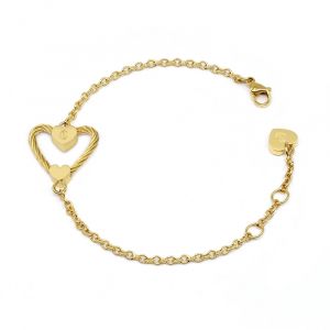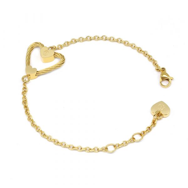 Go for a gold look with this 18mm wide heart-shaped piece of jewelry, consisting of 2 heart-shaped patterns in yellow gold PVD steel connected by 2 strands of yellow gold steel cables, and highlighted on a soft yellow gold PVD steel bracelet. For her and for him, the bracelet fits sizes S to L (15.5cm to 17.5cm).