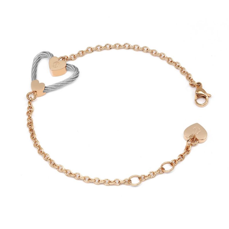 An 18mm wide heart-shaped jewel, composed of 2 strands of steel cables and 2 heart-shaped motifs in rose gold PVD steel, is highlighted on a soft rose gold PVD steel bracelet. For her and for him, the bracelet fits sizes S to L (15.5cm to 17.5cm).