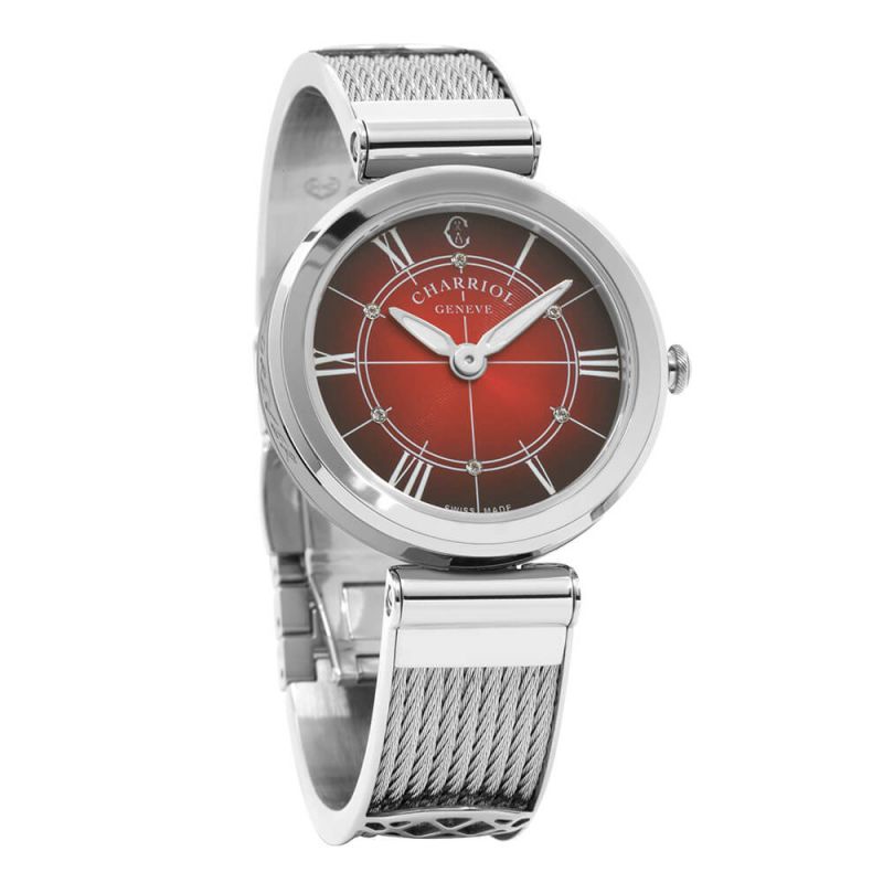 A 32 mm Swiss Made watch in stainless steel, powered by a Swiss quartz movement. Classic Roman numerals and 6 zircons decorate a sumptuous red dial combining circular engraving and brushed surfaces. The rigid bracelet - housing 9 steel cables, with folding clasp allows the Forever watch to be worn tightly or loosely on the wrist as a bangle.