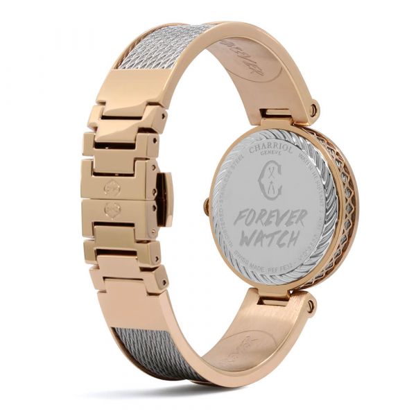 A 2 tone 32mm Swiss Made watch powered by a Swiss quartz movement. A striking dial features the iconic rainbow motif, a kaleidoscopic symbol of love, the arc of joy, hope and new beginnings. Six white zirconias and six waves in red, orange, yellow, green, blue and purple, the Charriol company colours, make up the dial. The rigid PVD rose gold bracelet - housing 9 steel cables, with folding clasp allows the Forever watch to be worn tightly or loosely on the wrist as a rigid bracelet.