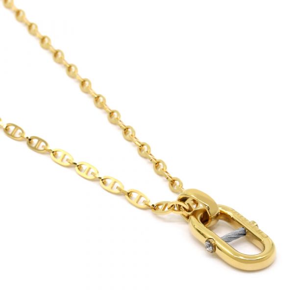 Yellow gold PVD stainless steel marine chain with an oversized marine chain link pendant - set with 2 zircons. This original yellow gold PVD steel piece is completed with a 3mm steel cable. Dimensions 24mm high * 12,5mm *4 mm. The chain is a replica of the chain of the exclusive St-Tropez watch bracelet. Its length of 40cm is adjustable by clasp with an extension of 5cm.