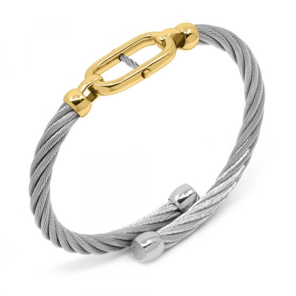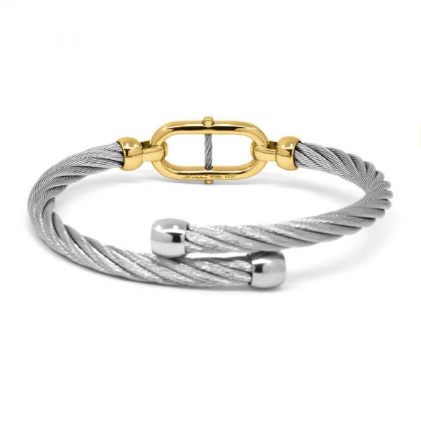 Stainless steel cable bangle decorated with a yellow gold stainless steel marine chain link. This bracelet with its overlaping 5mm diameter cable is a perfect unisex jewel available in 4 sizes S to XL (15.5cm to 18.5cm). Dimensions of the marine link 24mm * 12.5mm * 3mm.