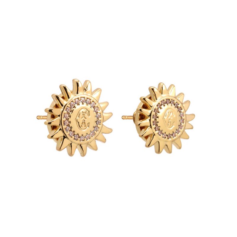A pair of stud earrings, yellow gold over brass with e-coating, elegant sun decor with engraved C logo and decorated with fine CZ stones. Actual size 13,5 mm diameter. This jewelry set is part of the Sunflare Collection, a line of striking jewelry that emits radiant joy.