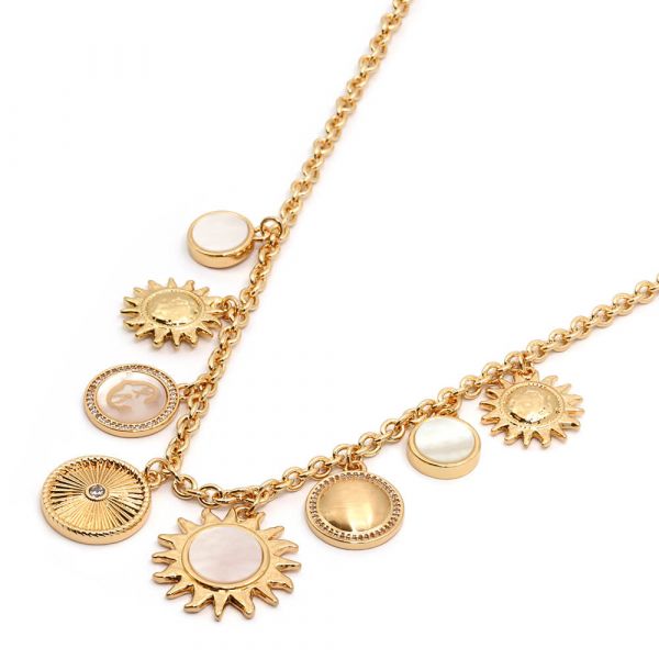 A beautiful necklace chain with oval links supporting 8 delicate charms. An original Charriol "sun" motif with either a slightly domed center in 18mm diameter or a white mother of pearl in 25mm. A 16mm disc surrounded by CZ stones with either a slightly domed center or a white mother-of-pearl decorated with a golden C logo, and finally an 18mm diameter charm with a sunburst pattern radiating from a central CZ stone. The set is completed by two white mother-of-pearl discs of 12mm. Ten links for the safety clasp allow a length of the necklace ranging from 40cm to 45cm.