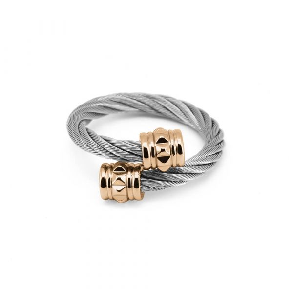 A ring made of 3mm stainless steel cable and rose gold PVD decors with an air of punk irreverence. Cylindrical, 4.6mm diameter corrugated end caps are punctured with matching studs that add textural intrigue to a beloved design.