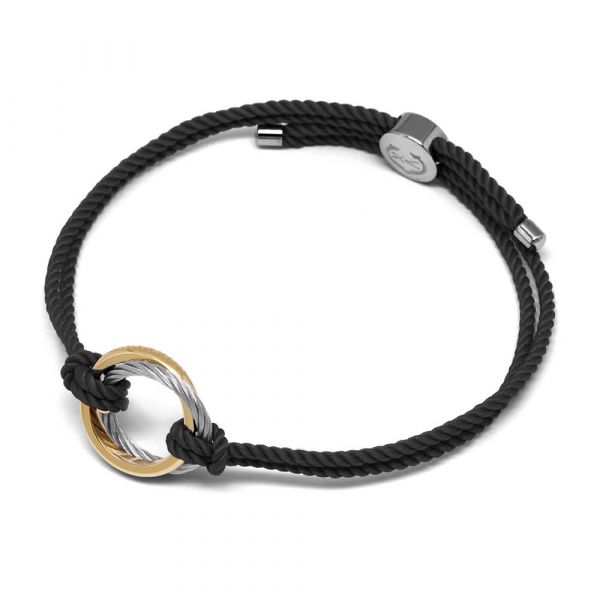 A black strap bracelet featuring a central decoration of 18mm in diameter, composed of 2 intertwined circles, the first in steel PVD yellow gold, the second in steel cable 2mm. The ends of the bracelet and the sliding element of the size are in stainless steel. One size fits all bracelet sizes from S/15.5cm to XL/18.5cm.