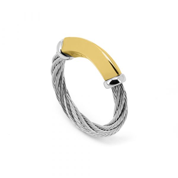 A yellow tone unisex ring made of a stainless steel 3mm cable and yellow gold PVD rectangular prism decor. Available sizes S to XL (from 50 to 60).