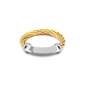 A two-tones unisex ring made of a yellow gold PVD cable (3mm diameter) and stainless steel rectangular prism decor. Available sizes S to XL (from 50 to 60).