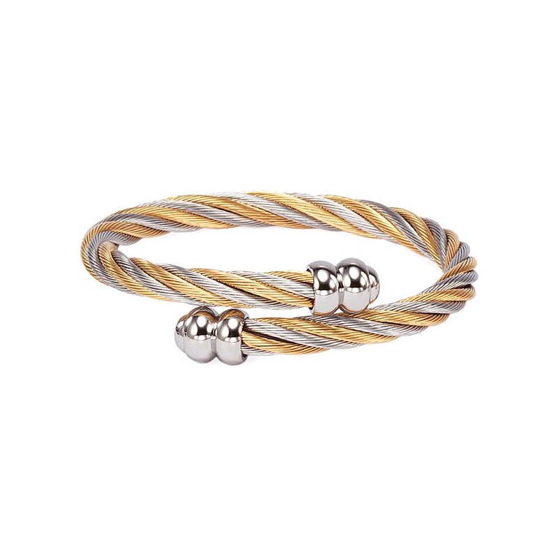 A signature piece from Art Director Coralie Charriol-Paul, this elegant bangle is a modern reworking of a Celtic torque. Our iconic woven cable in hypoallergenic stainless steel and titanium, colored in yellow gold and steel, is formed into a unisex open-shank design, punctuated with polished steel end pieces. Contemporary and stylish, this timeless piece can be adjusted to find the perfect fit.