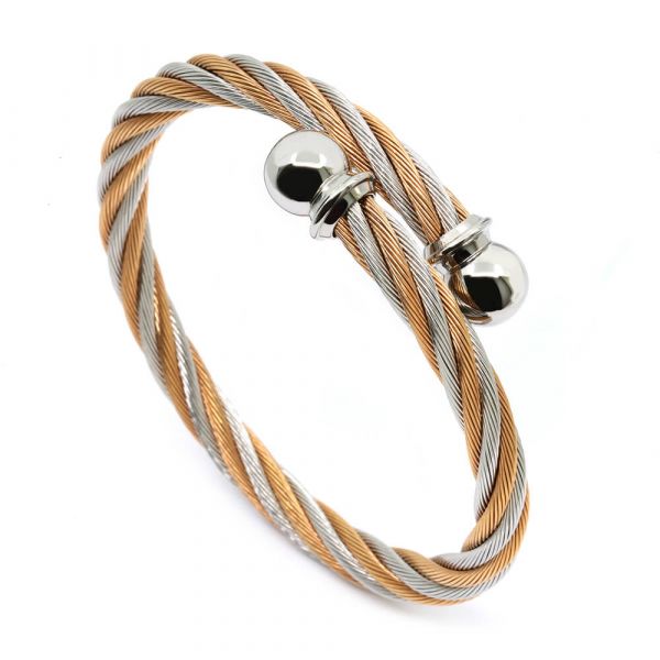 A signature piece from Art Director Coralie Charriol-Paul, this elegant bangle is a modern reworking of a Celtic torque. Our iconic woven cable in hypoallergenic stainless steel and titanium in steel and rose gold plating is formed into a unisex open-shank design, punctuated with polished steel end pieces. Contemporary and stylish, this timeless piece can be adjusted to find the perfect fit.